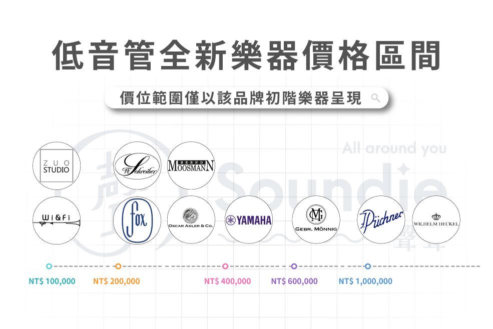 低音管樂器的價格區間非常廣(和音域一樣呢),在【專為初學者打造的低音管課程】中所推薦的樂器品牌,起始價格落在新台幣二十萬元。